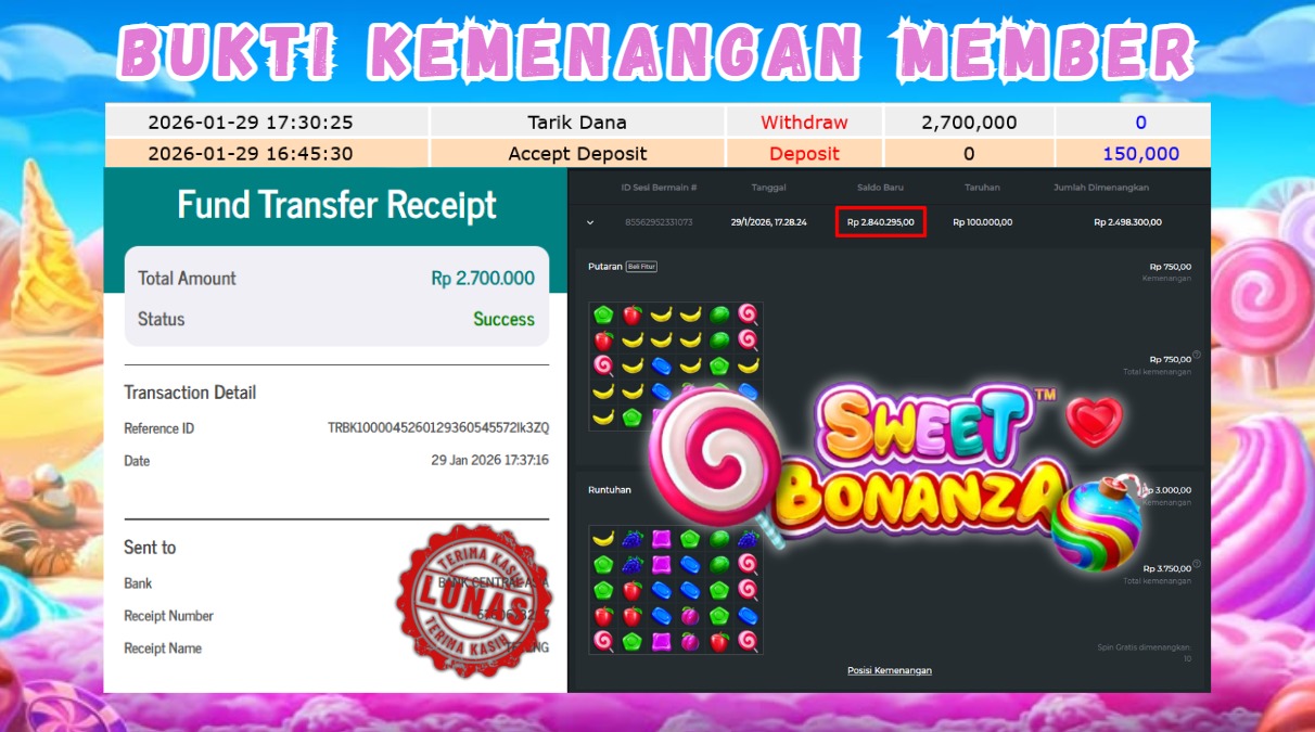 Kami percaya bahwa kepercayaan pemain dibangun dari bukti nyata, bukan sekadar klaim. Oleh karena itu, setiap kemenangan yang ditampilkan berasal dari transaksi real member dengan nominal beragam, mulai dari jutaan hingga ratusan juta rupiah.